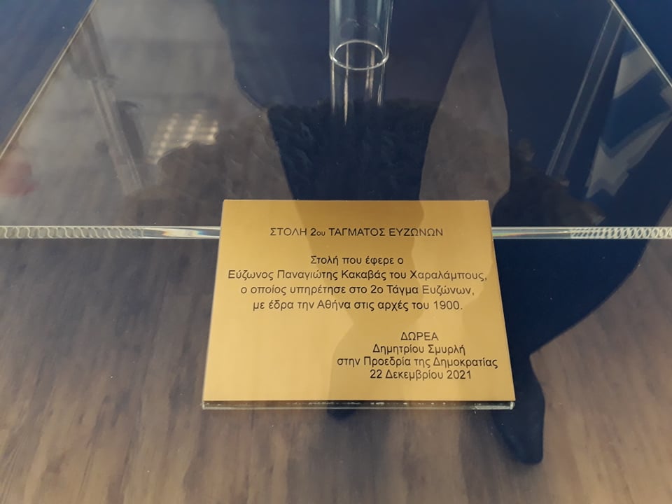 Η στολή εκτίθεται στην Αίθουσα Τιμών της Προεδρικής Φρουράς, προσφέροντας μια ζωντανή σύνδεση στους υπηρετούντες Ευζώνους με την σπουδαία υπηρεσιακή κληρονομιά που κουβαλούν στους ώμους τους.