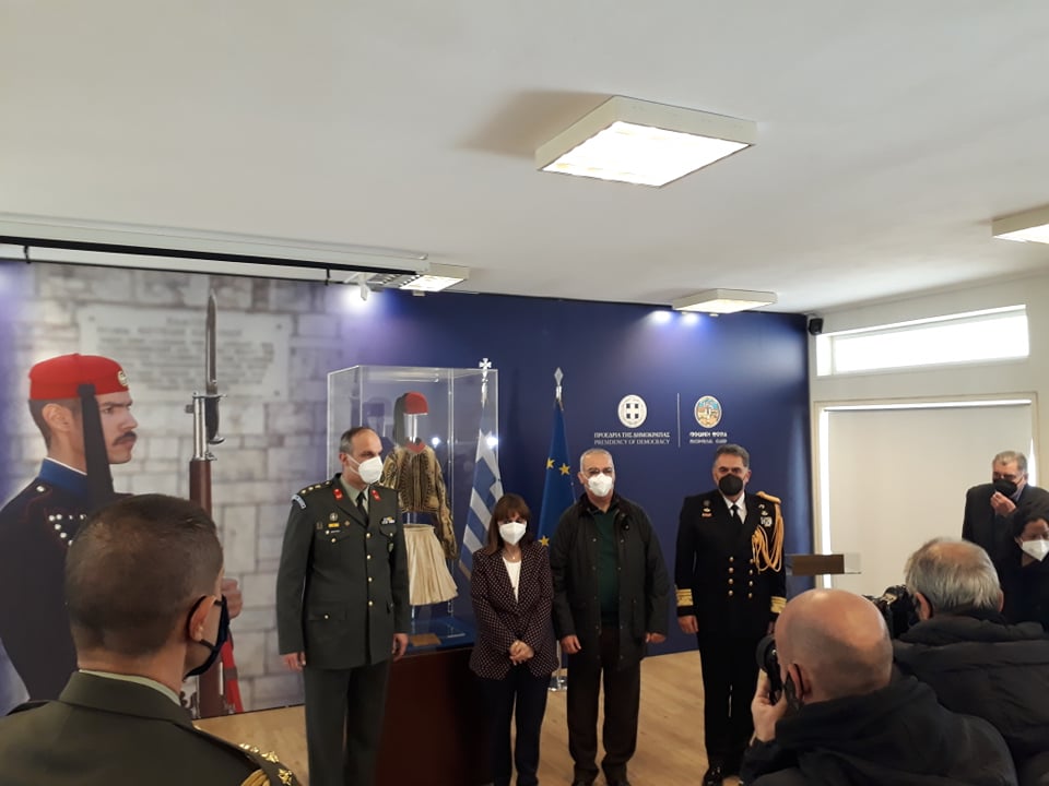 Με την ευκαιρία της εορτής του Προστάτη Αγίου της Προεδρικής Φρουράς, ως δεύτερο σκέλος της εκδήλωσης, ακολούθησε στην Αίθουσα Τιμών του στρατοπέδου της Προεδρικής Φρουράς η επίσημη αποδοχή δωρεάς ευζωνικής στολής.